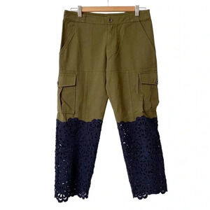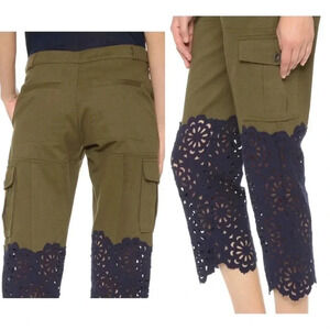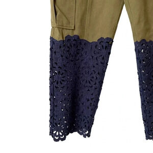 Sea New York pants, lace cargo pants, olive green twill pants, feminine utility pants, designer cargo trousers, lace trim pants, scalloped hem pants, boho edgy streetwear, casual chic, military-inspired style, statement pants, women’s size 4 fit, elevated casual trousers, Sea lace pants, modern feminine cargo