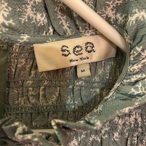 Chic casual dress with ruffle sleeves. Features a delicate green and white pattern. Ideal for everyday wear. EUC
