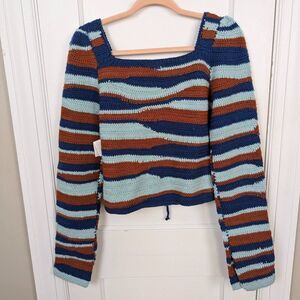 Trendy striped crochet sweater with wavy pattern in blue, brown and mint tones. Perfect for casual layering with modern appeal.