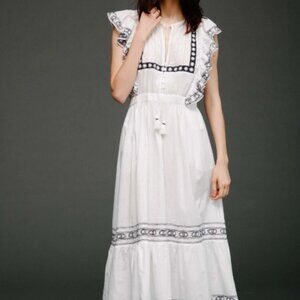 Beautiful white midi dress with bold black accents. Features ruffled sleeves and detailed trim.