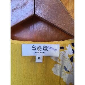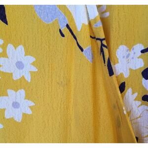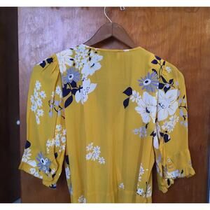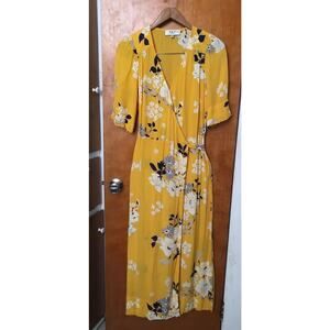 Bright yellow midi dress with floral print. Features a V-neck and short sleeves. Perfect for casual outings.
