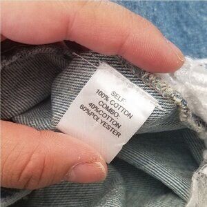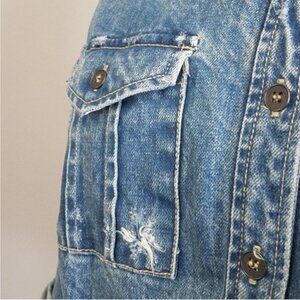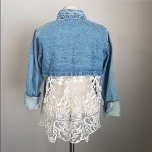 Sea New York denim blue with white lace back shirt jacket. Features destroyed & distressing for a relax look. A delicate lace back & buttons for closure.