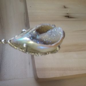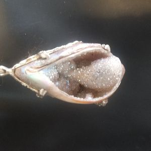 Pendant is very sparkling with druzy and the outside of the shell is shiny and irradence with color. These pictures do not completely show the true beauty! Pendant is 2 1/2 inch from the bale to the bottom. Comes with a 24 inch silver chain. Beautiful!
