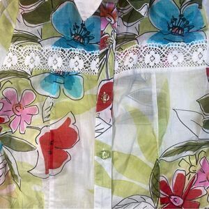 Sea Suns Vintage Semi-Sheer Floral Button Down Shirt Size Small. Excellent pre-owned condition. 100% rayon. 3/4 sleeves. Front clear decorative green buttons. Lace accents across chest and lower back with tiered ruffle. Measures approximately chest 36", length 25.5", sleeve 16".
