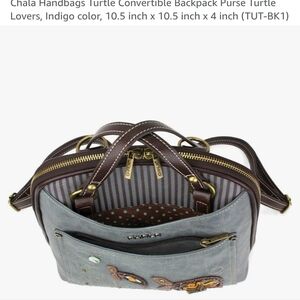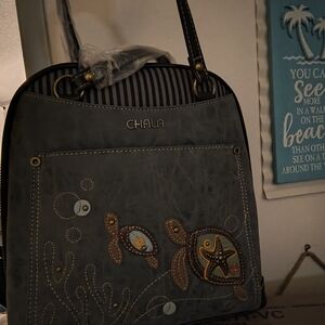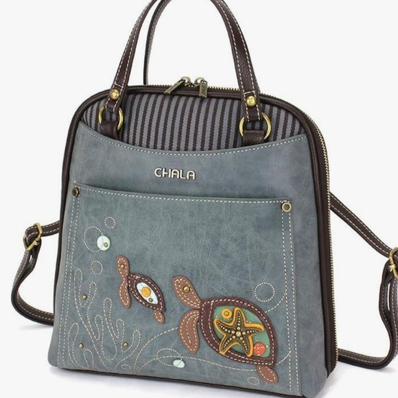 Chala backpack with charming turtle embroidery. Features gray and brown tones. Perfect for daily use.