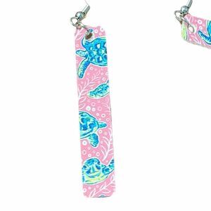 Features: sea turtle pattern, pink background, teal and green turtles, bar shaped dangle earring, fabric back, silver tone hook