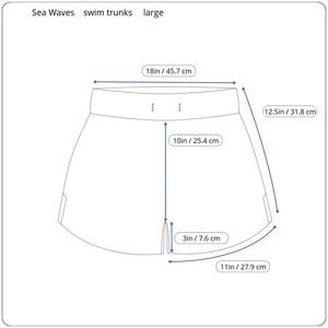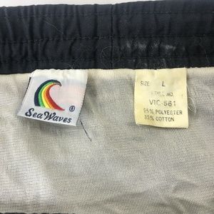 Sea Waves Mens Shorty Shorts Swim Trunks Hawaii Rainbow Pride Vintage 80's LLined. Inner liner leg elastic has dried out and will no longer stretch.One inner rear right pocket. Waistband has inner elastic with drawstring. Please note elastic is somewhat stretched.Shorts are in excellent vintage preowned condition. Minimal wear. No flaws.Embroidered"Hawaii" on left leg.Please see photos for exact details and measurements diagram.Fast shipping