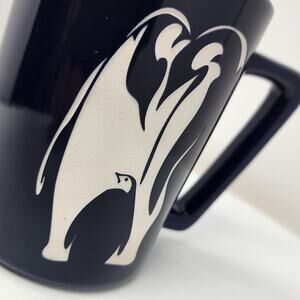 Sea World Etched Penguin Ceramic Coffee Mug Navy Blue White Accent Logo on Handle
