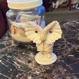 A jar of shells an sand a shell made like a owl big shell an a little dolphin statue