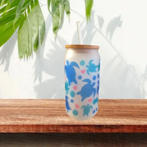 18oz (550ml) sea turtle frosted glass beer can, includes bamboo lid and glass straw (this lid does not have a silicone ring around the straw)