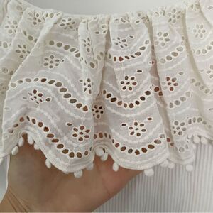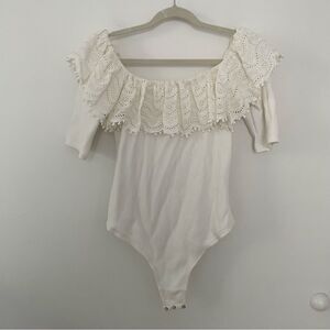 One piece body suit in ribbed kit cotton, eyelet fabric ruffle.
