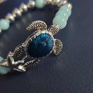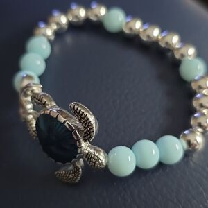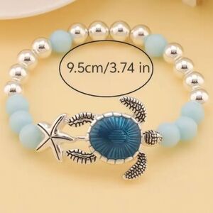 Elegant beaded stretch bracelet featuring a sea turtle design with silver and blue beads. Perfect for adding a touch of ocean-inspired charm to any outfit.