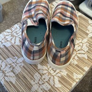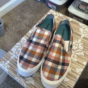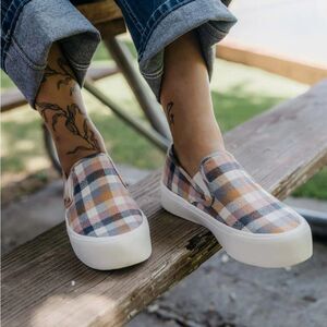 Women's platform slip-on sneaker made with soft cotton check flannel.