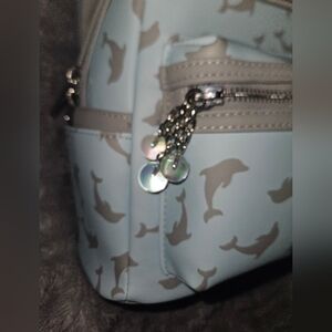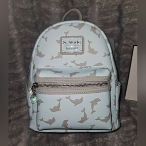 Charming mini backpack with dolphin print. Features a front zip pocket and SeaWorld logo.