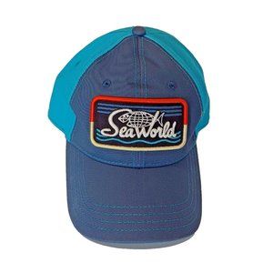 SeaWorld Orig Logo Patch Mens Blue Trucker Cap Strapback Hat w/ Embroidered Logo