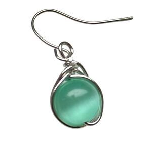 TAGS: seafoam glass earrings, wire wrap dangle earrings, silver tone jewelry, beach glass style drops, modern gift earrings, polished glass cabochon, lightweight earrings, casual statement jewelry, simple drop earrings, faux chalcedony earrings, faux seaglass earrings