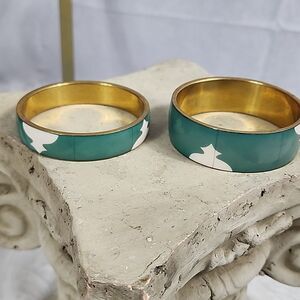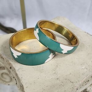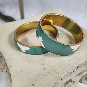 Two deep seafoam colored bangles with white patterns, 3" in diameter