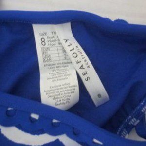 Stylish Seafolly bikini bottom. Features blue and white wave pattern. Perfect for beach days.