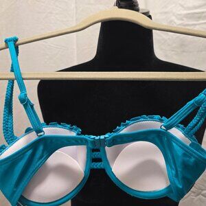 Turn heads at the beach or pool in this brand new Seafolly Eden bikini set in a gorgeous shimmer turquoise blue. This two-piece set includes a bustier-style top with braided detailing and molded cups for support, along with matching hipster bottoms featuring flattering ruffle trim. Both pieces are size 10 and come with original tags attached.
