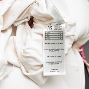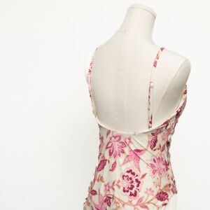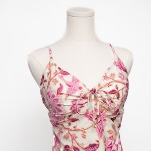 Seafolly Silk Road Swimsuit. Inspired by vintage florals and infused with Asian influence with florals and birds in the print, this strappy one-piece from the Australian label features soft triangle cups, a flattering sweetheart neckline, and a tie-front detail. Crafted from a lightweight, stretchy nylon blend with gold-tone hardware and full lining for comfort, it offers medium coverage and timeless summer charm. Style No. unknown—message if you need more info.