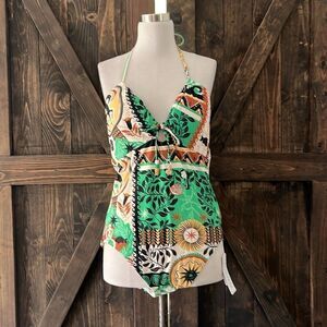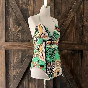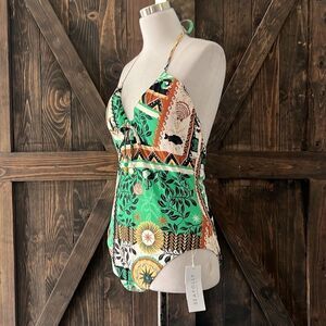 Seafolly Green Drawstring Halter Printed Atlantis Ecru Swimsuit One Piece