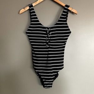 Seafolly Inka Stripe Lace Up One Piece Swimsuit Size 8 Black White Ribbed