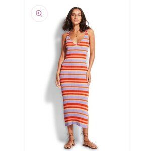 Seafolly Sundancer Midi Dress Ribbed Knit CoverUp Sleeveless Striped Red Small S