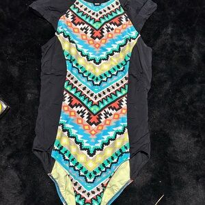Colorful bodysuit with geometric design. Soft and comfortable for play. Size 16