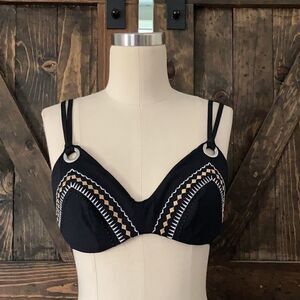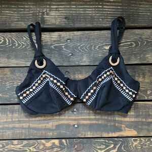 Great condition size 8D has slender straps loop through metal grommets to create a nice bikini top has underwire in bust cup pretty decoration metallic embroidery, only bikini top ,