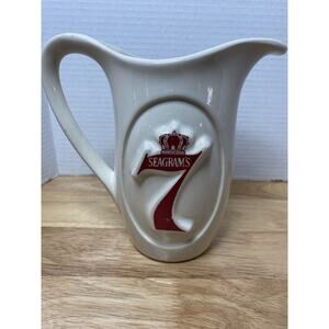Serve up your favorite beverage in style with this vintage Seagram's 7 ceramic pitcher. The ivory color and rounded handle give it a classic feel that is perfect for adding to your bar or mancave decor. This original piece is sure to be a conversation starter, with its theme of distillery advertising from a bygone era. Whether you're a collector or just looking for a unique addition to your home, this pitcher is the perfect choice.