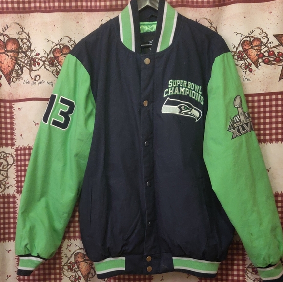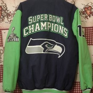 Seahawks Super Bowl Championship Jacket. Size large.Jacket has 2 interior and 2 exterior pockets.Made of 100 percent cotton and 100 percent polyester. Never worn to big.