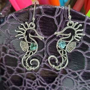 Seahorse Dangle Earrings Turquoise Glass Center Stones L👀K New Costume Jewelry