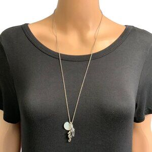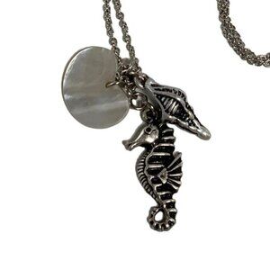 This elegant necklace showcases a unique seahorse pendant paired with a shimmering mother of pearl shell. The silver chain adds a touch of sophistication, making it a tasteful accessory for business or formal settings.