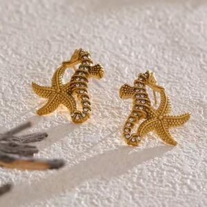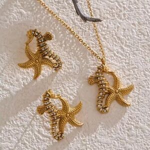 Elegant gold jewelry set featuring a seahorse and starfish design. Perfect for adding a touch of ocean-inspired charm to any outfit.