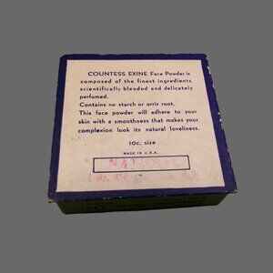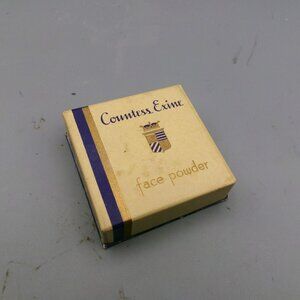 Vintage Countess Exine Face Powder Unused in Original Box. The box measures 2 1/2 inches square. The seal is still over the powder. The color is Natural. The box shows a bit of wear, but overall it displays well. Please view all photos for condition and details. Nice piece for your vanity collection.