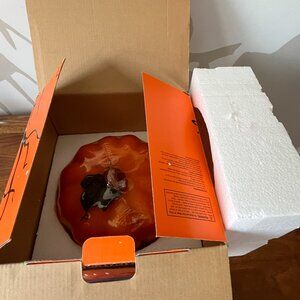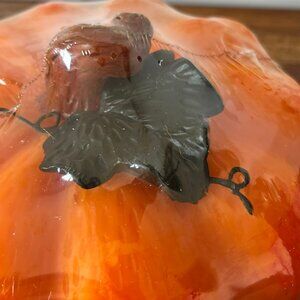Terrific, vintage JC Penney Home Collection Wax Pumpkin Candle, perfect for fall and Halloween. The candle is unused and sealed in plastic within the original box and packaging. It appears from the box image that the candle has three wicks. It is large and is about 7" diameter. It sits on a black, round stand. The box has light wear.
