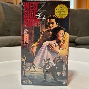 Experience the magic of classic cinema with this factory-sealed VHS copy of West Side Story — the 1961 Best Picture Oscar winner! Released by MGM/UA Home Video in 1991, this collector’s edition features Natalie Wood, Rita Moreno, and George Chakiris in an unforgettable retelling of Romeo & Juliet set to Leonard Bernstein’s iconic score. Packaging includes the original shrink wrap with promo sticker for a $5 rebate offer.