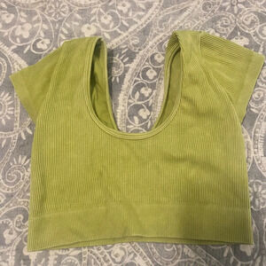Elevate your casual wardrobe with this PRISTINE Aerie Ribbed V-Neck Cropped T-shirt in Bright Lime Green. The scoop neckline and cap sleeves add a touch of elegance to this fitted top. The pullover closure and seamless features make it perfect for travel and everyday wear.