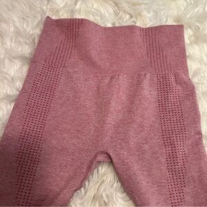 Good condition, has one small rip/hole near hem as pictured. Unbranded. Seamless leggings. Light pink heathered color with textured dots. Size small. Stretch 54% nylon, 34% polyester, 12% spandex. Waist 12.5” Inseam 24” Front Rise 10”. All measurements are approximate and taken lying flat. Smoke free home. No trades, offers welcome.