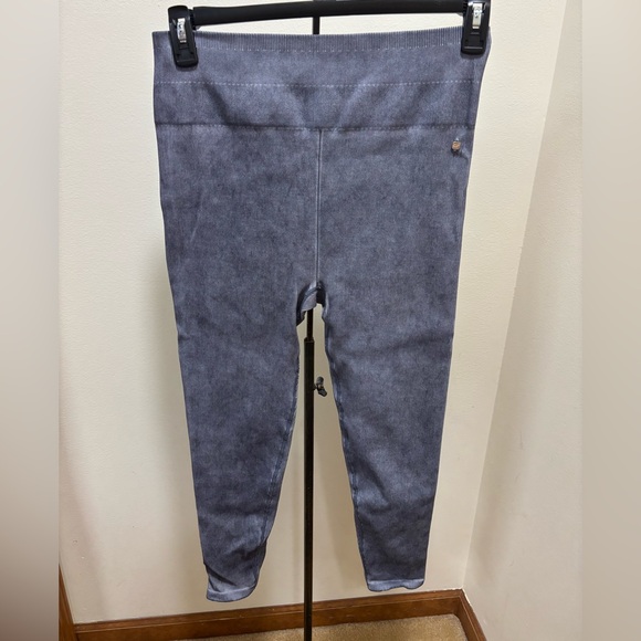 Blue almost acid-wash looking ribbed seamless leggings from Fabletics. The main tag has been cut out.