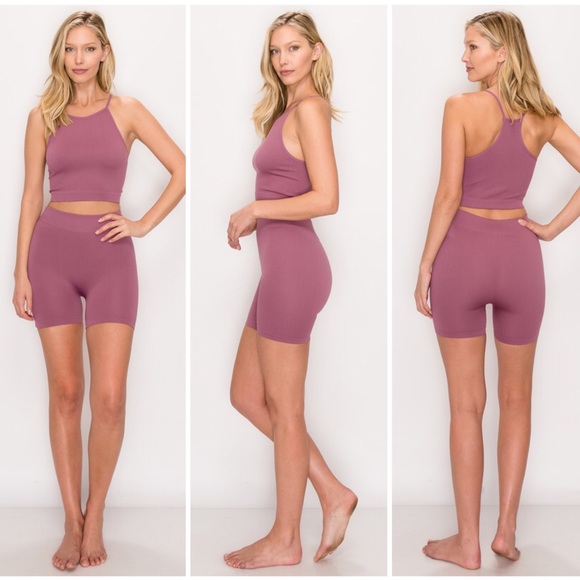 Seamless Ribbed Spaghetti Strap Tank and Biker Short 2pc Set. MEASUREMENTS: HPS: S-14" M-14.5" L-15" Inseam: S-4" M-4.5" L-5" Machine wash cold (Gentle cycle), Tumble dry low or Hang Dry.