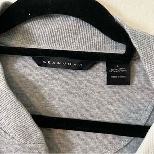 Sean John Jacket. Track Jacket. Men. Size Large. Gray Tan Cream. Snap Front. 60% cotton 40% polyester. Length from shoulder to bottom is 28”. Armpit to armpit is 24”.