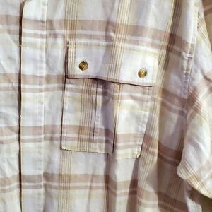 White and tan windowpane plaid button up shirt. Short sleeves. Flapped double button pockets on the chest. Rounded bottom hem. 55% linen and 45% cotton.