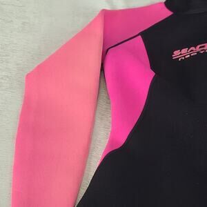 This Seaquest women's full wetsuit is in good used condition and ready for your next adventure! While there is some slight fading to the pink areas on the arms and minor piling on the stomach, the rest of the suit is in excellent shape. Please refer to the pictures for a closer look at the details. Don't miss out on this great deal!