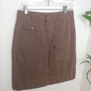 Searle Vintage Brown Utility Cargo Skirt size 4. Woven in Spain, made in the US. Zipper fly with button closure. Multiple buttoned pockets. Belt loops. Concealed side zippers on both sides going up the thigh. In overall great shape. Some light fading, as would be expected.