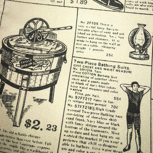 VINTAGE~ Unique black and white tote printed with pictures and description of items and prices from the 1906 Sears Roebifuck Catalog. This would be great framed! Heavy white canvas fabric is washable. Two double stitched canvas handles. 9" drop, tote is 12" X 14" Slight smudge on the corner, not really noticeable, but I wanted to mention it.