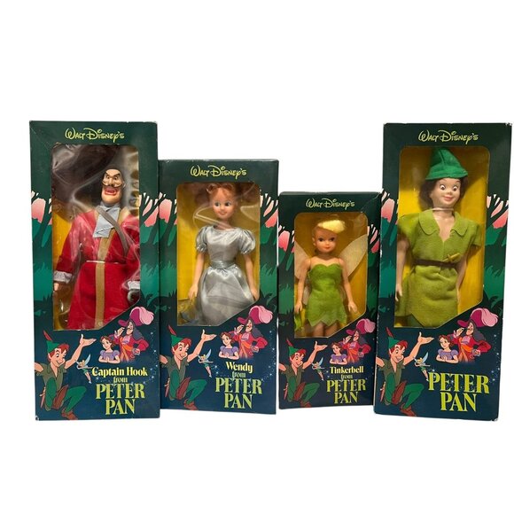This collectible set of Walt Disney's Peter Pan dolls includes four charming characters: Captain Hook, Wendy, Tinkerbell, and Peter Pan. Each figure is beautifully designed, capturing the essence of the beloved movie. Ideal for collectors and Disney enthusiasts, these dolls are in their original packaging, ensuring authenticity and preservation. Purchased from Sears.