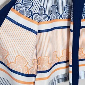 Vintage Sears women's cardigan with a bold mid-century pattern knit in a navy and caramel palette. Likely from the 1970s. Open front construction with a soft acrylic blend and a relaxed, drapey fit. Graphic sweater vibe with vertical stripe accents and a repeating retro motif across the chest and hem.It’s got that lived-in feel and just enough stretch for easy layering over a tee or button-up.