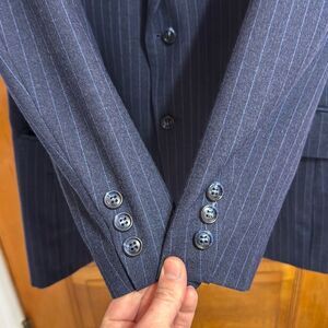 Excellent condition vintage wool Executive II from Sears navy blue pinstriped men’s two button blazer men’s size US 40L. Measurements taken flat are approximately: