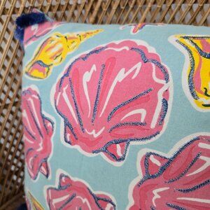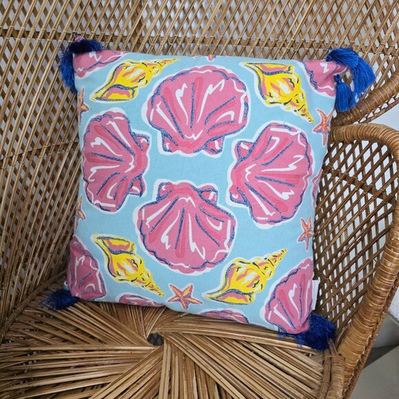 Immerse your home in the tranquil beauty of the seaside with this coastal-inspired throw pillow. Adorned with vibrant seashell motifs in pink and yellow hues, it captures the essence of the ocean. Blue tassels on each corner add a touch of whimsy, while the seafoam background brings a calming ambiance. Ideal for beach-themed decor or adding a splash of color to any room.
